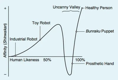 *Nota da Autora: Isto é muito interessante, pois quando algo é muito diferente, como um animal ou personagem claramente fictício (tais como os bonecos do Toy Story), não tentamos nos comparar, não atingimos o vale. Mas quando algo ocupa o nosso nicho e parece uma "versão alternativa" de nós mesmos, isso gera uma ameaça à nossa identidade como ser humano e nos gera total insegurança.